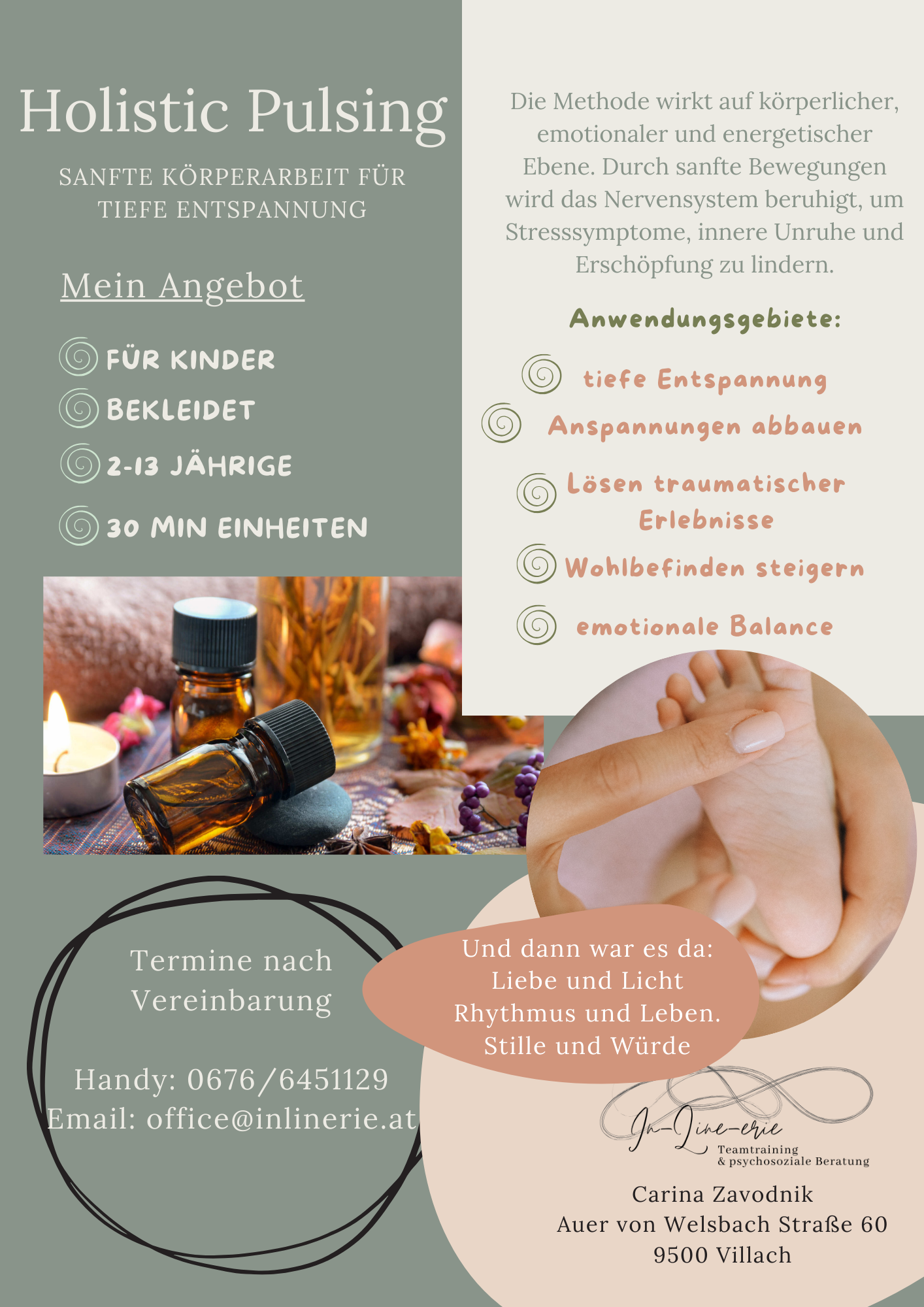 Die Körperarbeit ist bei Kinder, Jugendlichen und Erwachsenen gleichermaßen wirkungsvoll und führt zu einer tiefen Entspannung. Du darfst einfach genießen und dich ganz in die Liege fallen lassen. Ich freue mich auf DICH!!!